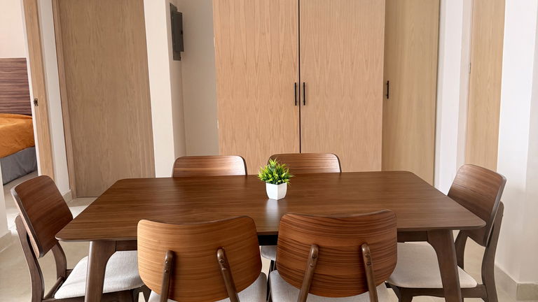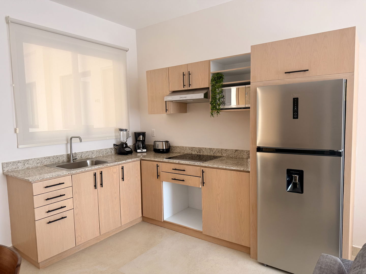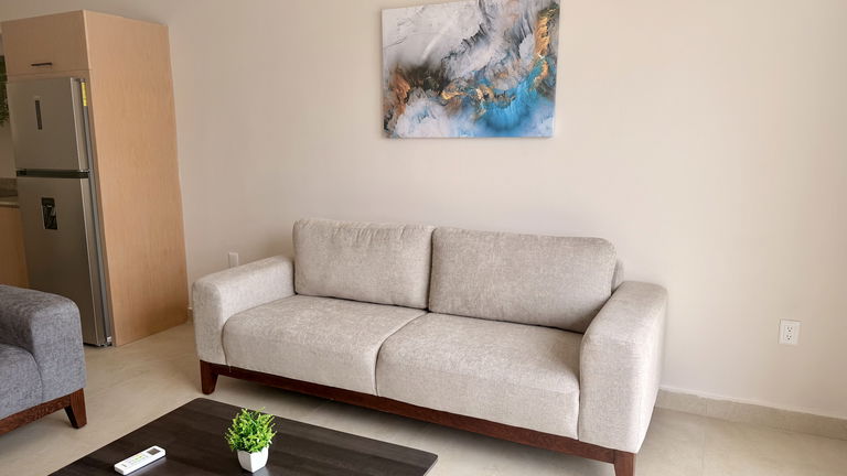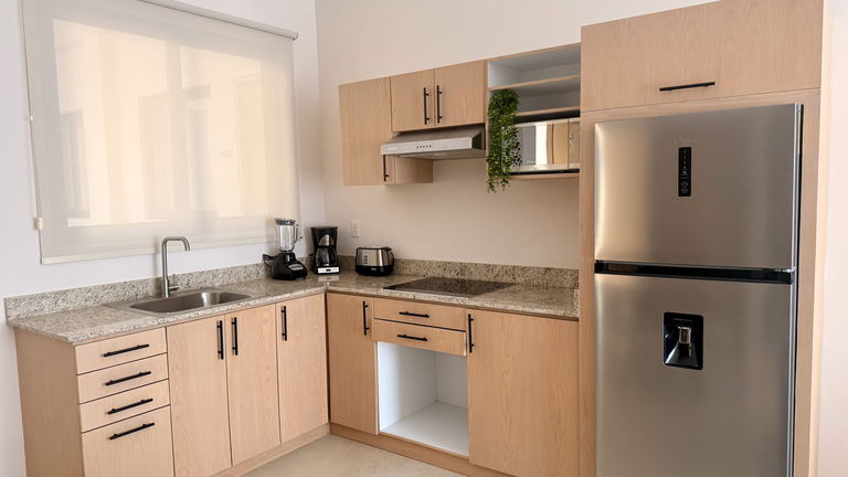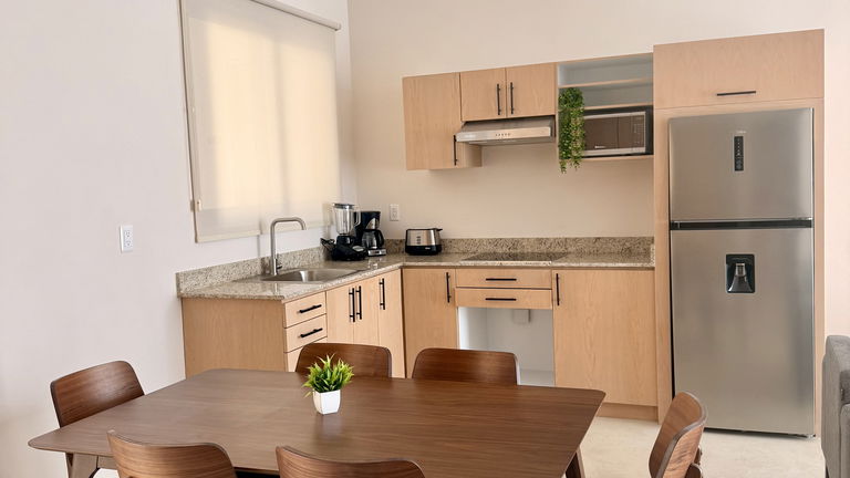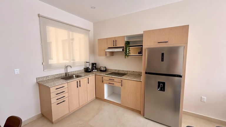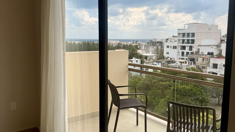 Disfruta de una estancia perfecta para compartir en nuestra Family Two Bedroom Balcony, un espacio diseñado para ofrecer comodidad, estilo y momentos inolvidables en familia o con amigos. Esta amplia suite cuenta con dos recámaras: una con cama King y otra con cama Queen, ambas pensadas para brindar el máximo descanso. El área social combina elegancia y confort con un sofá de dos plazas, un butacón y una mesa de centro, creando el ambiente ideal para relajarse o disfrutar de una conversación. Comparte tus comidas en la mesa para comer, o prepara tus platillos favoritos en la cocina completamente equipada. Además, el balcón con vista a la icónica 5ª Avenida, amueblado con dos sillas, ofrece un rincón encantador para disfrutar de la brisa y el ambiente de la ciudad.