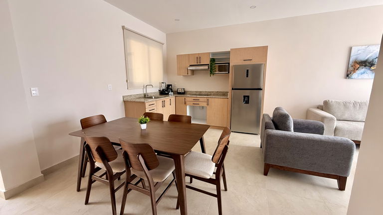 'Vive una experiencia de confort y elegancia en nuestra Interior One Bedroom Suite, un espacio diseñado para quienes buscan privacidad y estilo en cada detalle. La suite cuenta con una amplia recámara con cama King, ideal para un descanso pleno. Su área social ofrece un ambiente acogedor con un sofá de dos plazas, un butacón y una mesa de centro, perfectos para relajarse o disfrutar de una conversación. Comparte una comida en la mesa para cuatro personas o prepara tus platillos favoritos en la cocina completamente equipada. Además, su vista hacia el interior del lobby brinda una atmósfera tranquila y elegante, ideal para desconectarse del ritmo urbano.'
